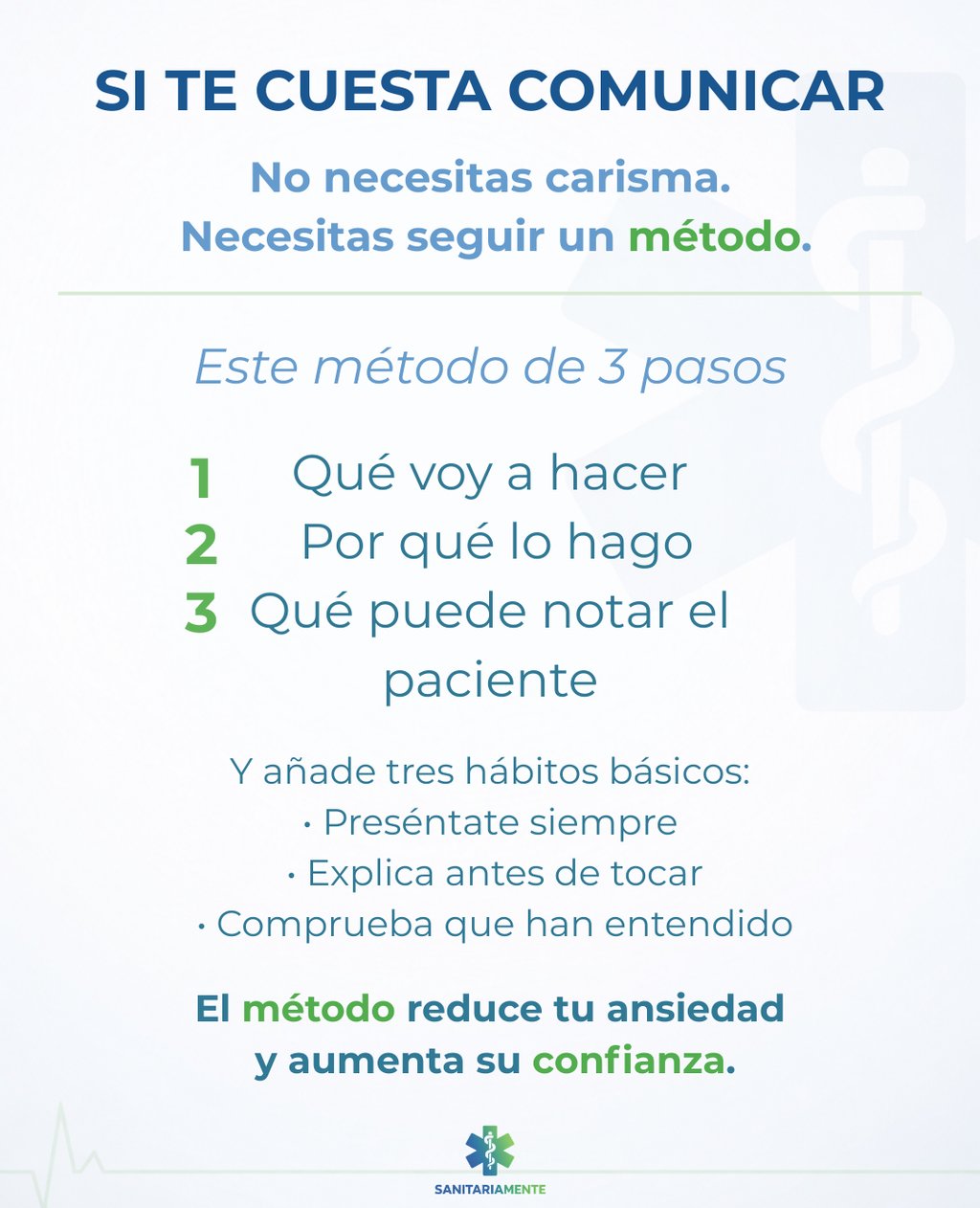 En este post hablamos sobre la importancia que tiene para todo el conjunto de los profesionales sanitarios el conocer tecnicas para mejorar la comunicacion, tanto con familias como con pacientes. La manera de decir noticias dificiles, explicar las situaciones que van a ocurrir, pronosticos.... Todo es muy imporante y no se entrena ni se conoce desde que estudiamos.
